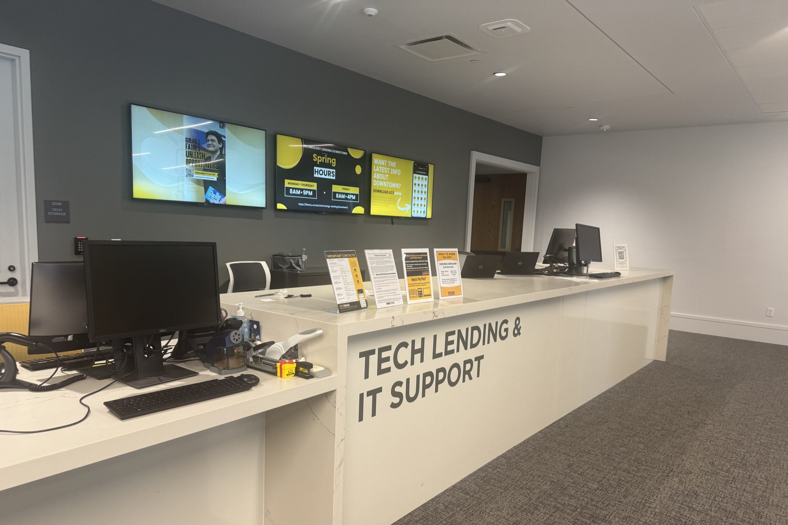 Downtown students have IT support and tech lending available on the second floor of Dr. Phillips Academic Commons East. Here, students can get help troubleshooting issues with their computers and borrow technology like cameras, MacBooks, laptops, cables, and more! Not on campus? Email itsupport@ucf.edu or call 407-823-5117 for assistance.